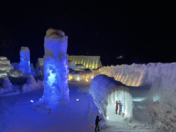 北海道の冬のイベントを代表する「千歳・支笏湖氷濤(ひょうとう)まつり」が27日、千歳市支笏湖温泉の第5駐車場で開幕した。会場には、湖の澄んだ水を掛け、造り上げた氷像約30基が並ぶ。26日夜にはライトアップの試験点灯が行われ、神秘的な空間が出現した。2月25日まで。